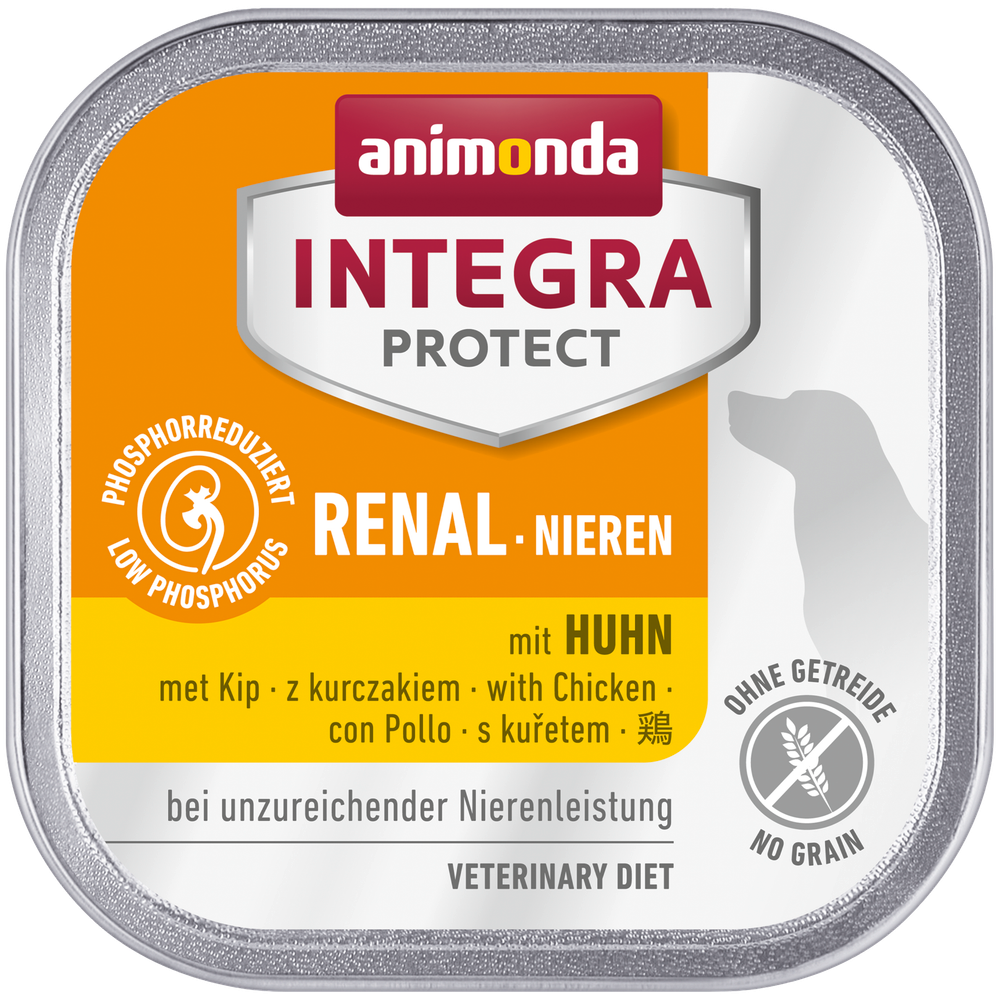 INTEGRA PROTECT Renal wurde speziell für Hunde mit chronischer Niereninsuffizienz entwickelt. Die deutlich geringere Zufuhr von Eiweißen verringert die auszuscheidene Menge an Eiweißabbauprodukten. Die gleichzeitige Reduzierung des Phosphorgehaltes verzögert den fortschreitenden Verlust der Nierenfunktion. Dadurch verbessert sich das Befinden der Hunde nachhaltig und die Lebenserwartung kann verlängert werden. Diese Diätnahrung wird ohne Getreide hergestellt und ist damit für Hunde mit einer Getreideallergie geeignet.- phosphorreduziert