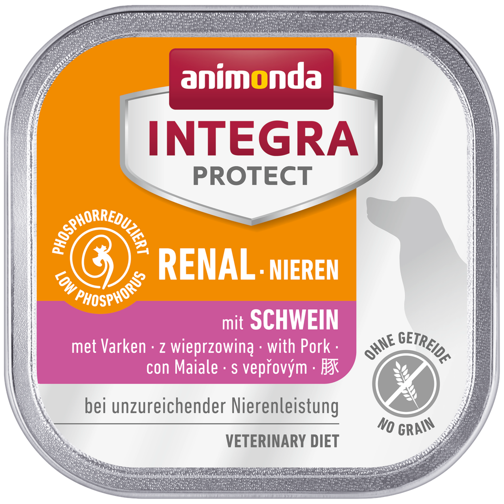 INTEGRA PROTECT Renal wurde speziell für Hunde mit chronischer Niereninsuffizienz entwickelt. Die deutlich geringere Zufuhr von Eiweißen verringert die auszuscheidene Menge an Eiweißabbauprodukten. Die gleichzeitige Reduzierung des Phosphorgehaltes verzögert den fortschreitenden Verlust der Nierenfunktion. Dadurch verbessert sich das Befinden der Hunde nachhaltig und die Lebenserwartung kann verlängert werden. Diese Diätnahrung wird ohne Getreide hergestellt und ist damit für Hunde mit einer Getreideallergie geeignet.
