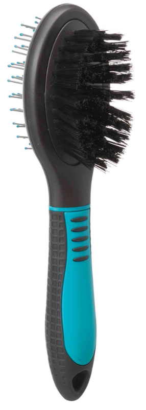 Praktische Bürste zur schonenden Pflege des Deckhaars und der Unterwolle Ihres Hundes. Die Bürste ist aus Kunststoff und ist beidseitig einsetzbar. Auf der einen Seite befinden sich Nylonborsten und auf der anderen Seite Drahtborsten mit Noppen. Der Griff ist mit einer rutschfesten Gummieinlage ausgestattet.- zur schonenden Pflege des Deckhaars und der Unterwolle