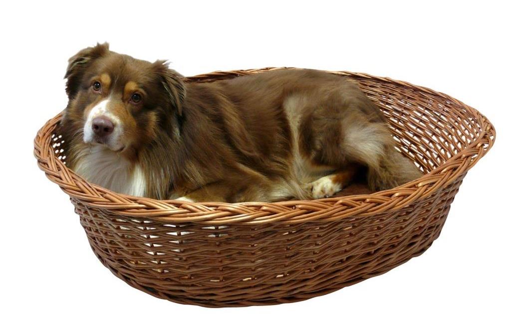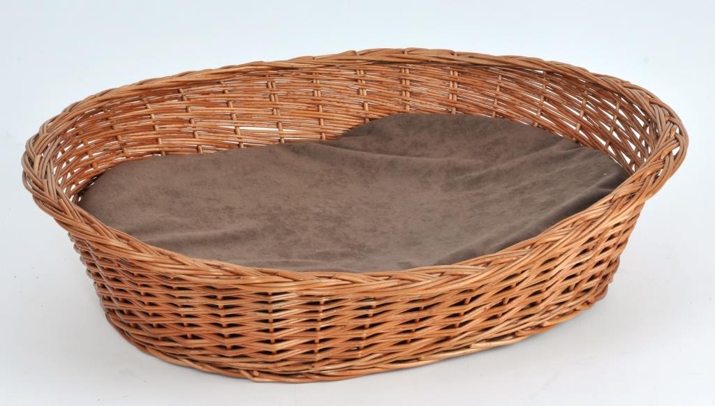 Ein aus Naturweide geflochtener Korb mit herausnehmbarem und waschbarem Kissen. Diese Größe ist ideal für größere Hunderassen