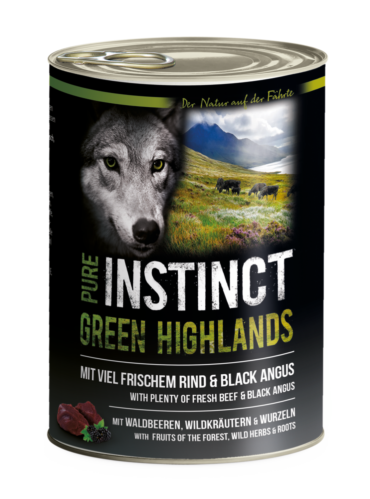PURE INSTINCT Green Highland - Der Hund als liebevoller Begleiter des Menschen sollte artgemäß und nach modernen Erkenntnissen der Forschung ernährt werden. Die züchterische Entwicklung des Wolfes zu mehr als 400 Hunderassen hat zwar Größen, Formen, Farben und sogar Teile des Verhaltens verändert, jedoch kaum den Bau und die Funktion des Verdauungstraktes. Bei Untersuchungen wurden im Magen des Wolfes Fleisch, Wurzeln, Wildkräuter und Beeren gefunden. All diese Zutaten finden Sie in PURE INSTINCT. Zudem ist es getreidefrei, damit auch die Hunde PURE INSTINCT fressen können, die an einer Getreideunverträglichkeit leiden.