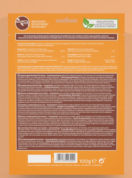 Insekten-Power! Für Hunde mit Charakter.Der „nachhaltige“ Hundesnack aus Grillen und Mehlwürmern kombiniert mit köstlichen Karotten. Die hochwertigen Zutaten bilden die Grundlage für ein delikates Snackvergnügen für jeden Hund. Bestehend aus alternativen Proteinquellen sind sie darüber hinaus ideal für ernährungssensible Hunde.
