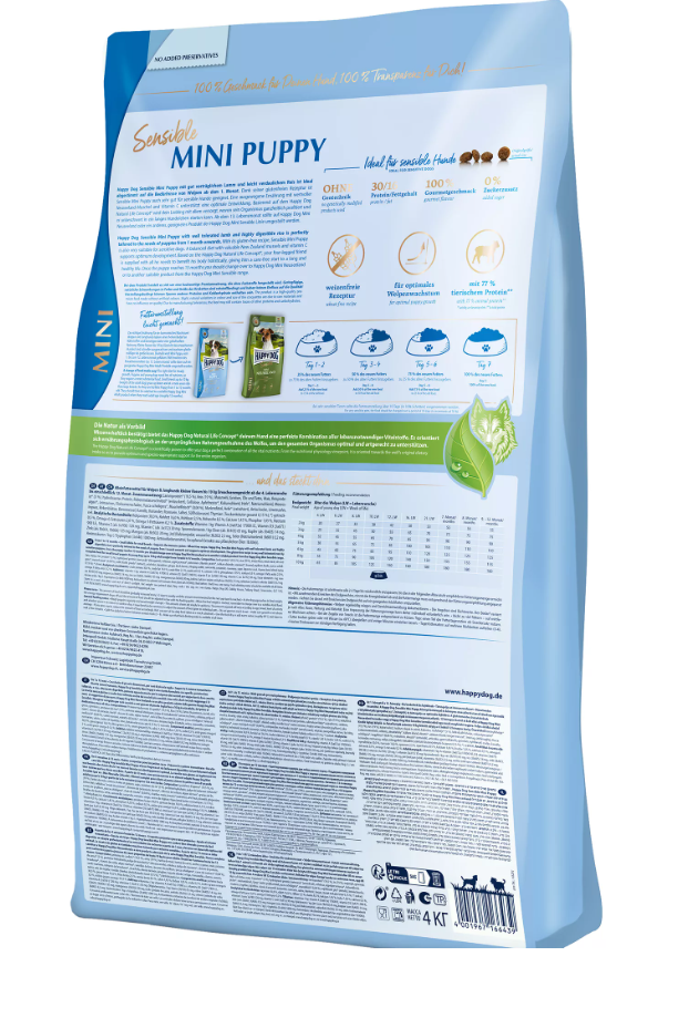 Dieses Futter mit gut verträglichem Lamm und leicht verdaulichem Reis ist ideal abgestimmt auf die Bedürfnisse von Welpen ab dem 1. Monat. Dank seiner glutenfreien Rezeptur ist Sensible Mini Puppy & Junior auch sehr gut für sensible Hunde geeignet. Eine ausgewogene Ernährung mit wertvoller Neuseeland-Muschel und Vitamin C unterstützt eine optimale Entwicklung. Basierend auf dem Happy Dog Natural Life Concept wird dein Liebling mit allem versorgt, wovon sein Organismus ganzheitlich profitiert und er unbeschwert in ein langes Hundeleben starten kann. Ab dem 13. Lebensmonat sollte auf Happy Dog Mini Neuseeland oder ein anderes geeignetes Produkt der Happy Dog Mini Sensible Linie umgestellt werden.Tierart: Hund