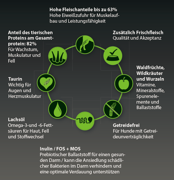 Hühnerfrischfleisch (47 %), Kartoffelstücke (getrocknet 23 %), Truthahnfleischmehl (16 %), Geflügelprotein (hydrolysiert), Rübentrockenschnitzel (entzuckert, 3 %), Leinsamen (2 %), Geflügelfett (1 %), Lignocellulose, Bierhefe (getrocknet, 0,5 %), Ei (getrocknet), Waldfrüchte (getrocknet, 0,2 % Johannisbeere, Holunderbeere), Natriumchlorid, Kräutermischung (getrocknet, 0,2 % Schafgarbe, Löwenzahnblätter, Löwenzahnwurzel, Kamille, Brennnessel, Spitzwegerich, Johanniskraut), Calciumcarbonat, Monocalciumphosphat, Hefeextrakt (getrocknet, 0,2 % Mannan-Oligosaccharide und Beta-Glucane), Chicorée-Inulin (0,1 %), Lachsöl (0,1 %), Glucosamin (0,02 %), Chondroitinsulfat (0,01 %)