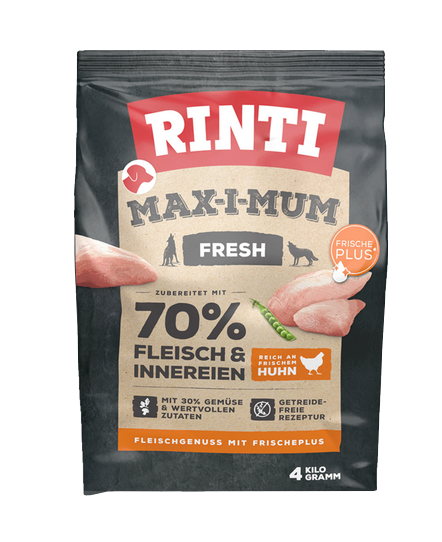 Rinti Max-i-Mum ist die ideale Wahl für deinen Hund!Mit 65% frischem Fleisch und frischen Innereien enthält es über 90% hochwertige Fleischmaterialien.