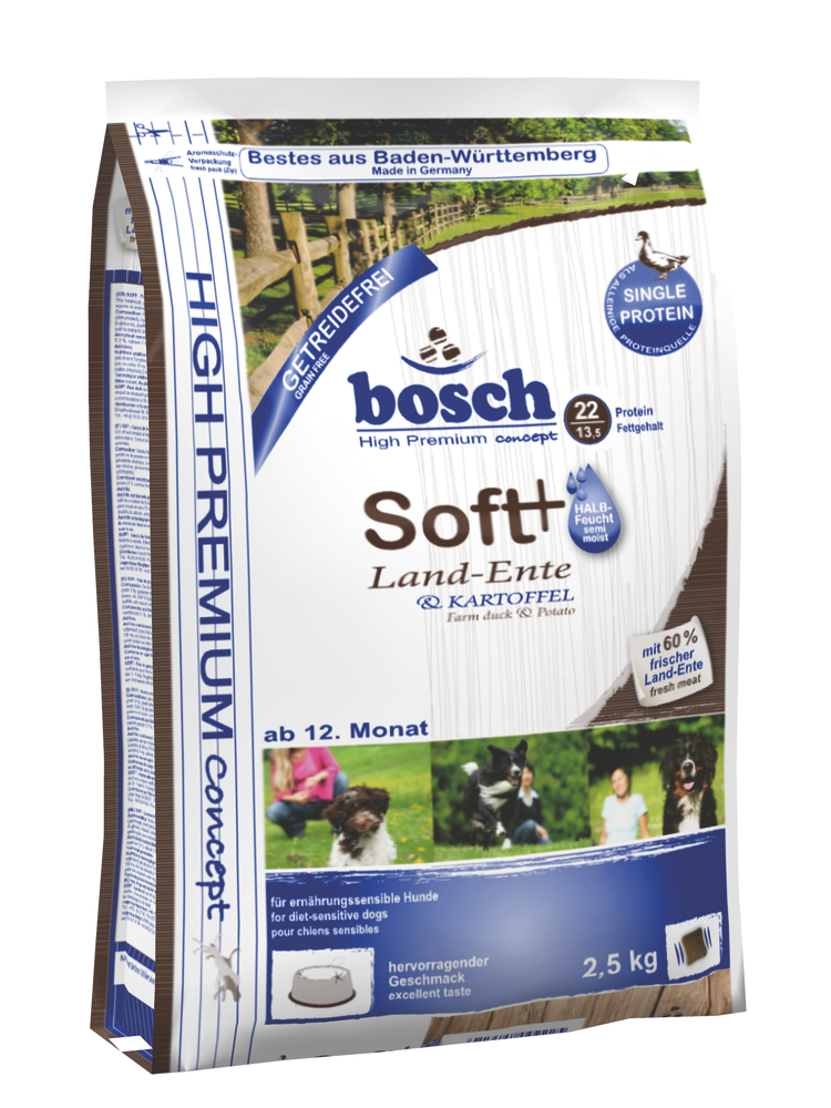 bosch SOFT+ Land-Ente ist besonders für Hunde geeignet die ein besonderes Geschmackserlebnis zur Futteraufnahme benötigen. Der hohe Anteil an frischer Landente (min. 60 %) als alleinige, tierische Proteinquelle und hochverdauliche Kartoffel als Kohlenhydratquelle verwöhnen ihren Hund schonend und natürlich getreidefrei. Die weiche Krokette (18 % Feuchte) macht bosch SOFT+ Land-Ente zu einem besonderen Geschmackserlebnis für ihren Hund. Ausgezeichnet als besonders schmackhaft und bekömmlich.Inverkehrbringer: bosch Tiernahrung GmbH & Co. KG, Engelhardshauser Str. 55+57, 74572 Blaufelden-Wiesenbach; E-Mail: info@bosch-tiernahrung.de