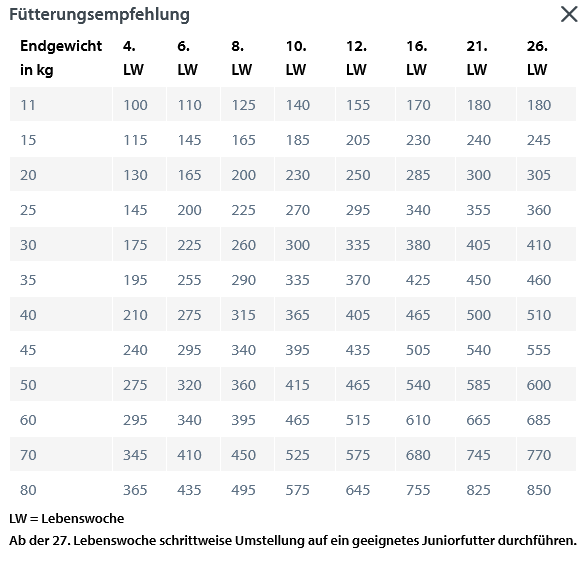 | Endgewicht in kg | Alter 4 Wochen | Alter 6 Wochen | Alter 8 Wochen | Alter 10 Wochen | Alter 12 Wochen | Alter 16 Wochen | Alter 21 Wochen | Alter 26 Wochen |