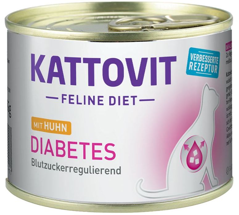 Kattovit Feline Diet - DIABETES wurde speziell entwickelt mit langkettigen Kohlenhydraten für eine geregelte Glucosefreisetzung. Ein hoher Rohfasergehalt (Ballaststoffe) in Verbindung mit reduzierten Fettwerten kann sich ausgleichend auf die Entwicklung der Blutzuckerwerte auswirken. Das Futter ist mit L-Carnitin angereichert worden. Dadurch soll sich der Stoffwechsel verändern und somit zu einer Gewichtsreduktion beitragen. L-Carnitin kann den Abbau von Fettreserven unterstützen. Nicht geeignet für heranwachsende und trächtige Katzen.Inverkehrbringer: FINNERN GmbH & Co. KG, Bahnhofstraße 11, 27283 Verden; info@finnern.de