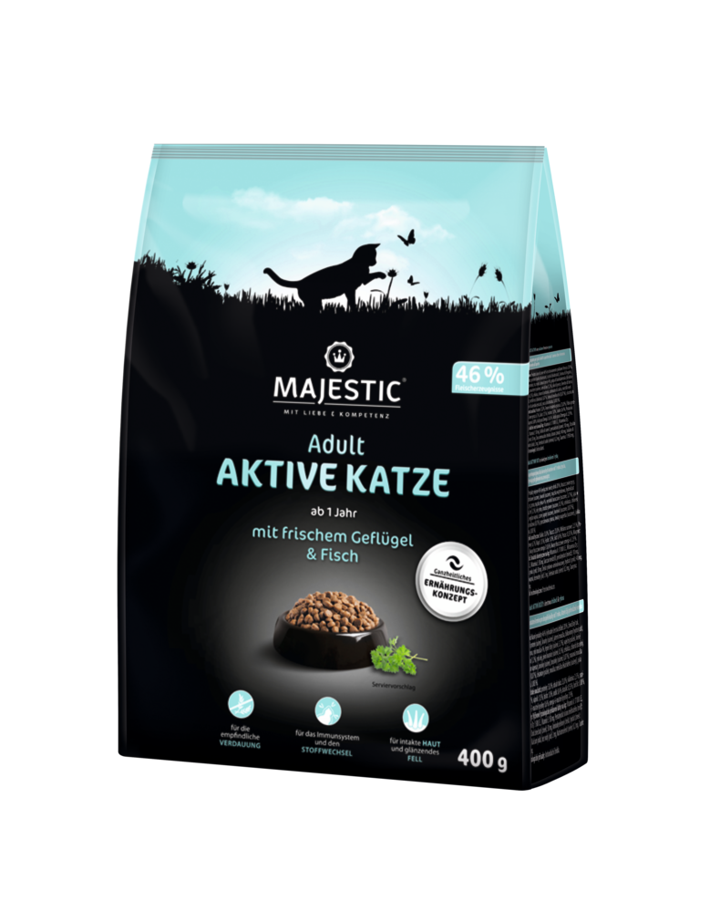MAJESTIC ist eine vollwertige Hauptmahlzeit mit wertvollen Proteinquellen für eine optimale Ernährung ausgewachsener Katzen. Aktive Katzen, die überwiegend draußen leben, haben einen deutlich höheren Energiebedarf als Wohnungskatzen. MAJESTIC AKTIVE KATZE wurde speziell an die Bedürfnisse einer draußen lebenden Katze angepasst und versorgt sie sicher mit allen Nähr- und Wirkstoffen, die sie für ein langes und aktives Leben benötigt.
