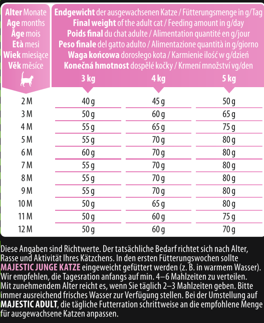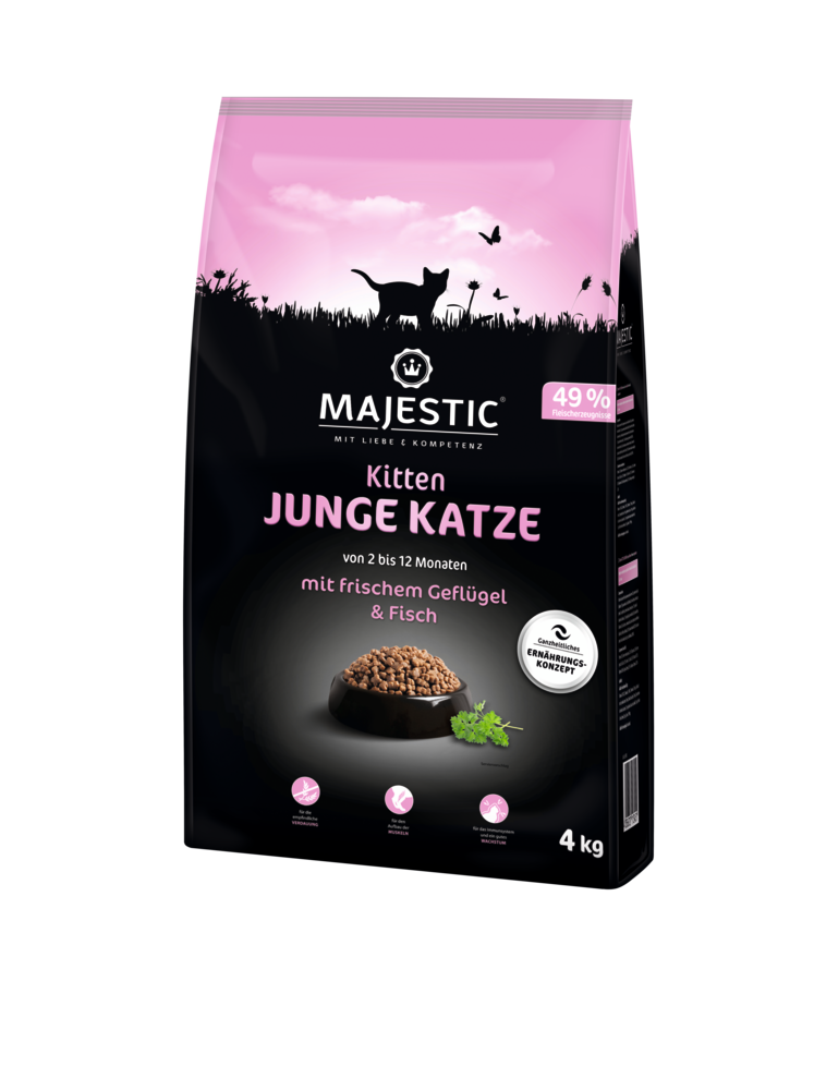 MAJESTIC ist eine vollwertige Hauptmahlzeit mit wertvollen Proteinquellen für eine optimale Entwicklung heranwachsender Kätzchen. MAJESTIC JUNGE KATZE unterstützt auf Grund seiner überdurchschnittlichen hohen Qualität in der Zusammensetzung und der vielen lebenswichtigen Nähr- und Wirkstoffen für eine optimale Entwicklung heranwachsender Kätzchen.