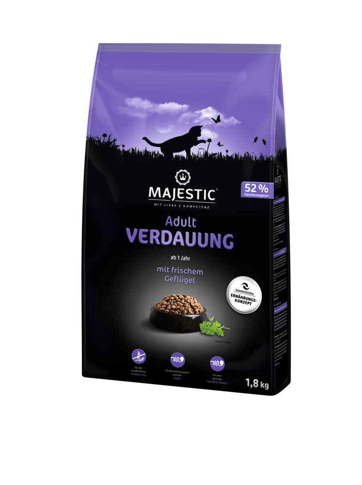 MAJESTIC ist eine vollwertige Hauptmahlzeit mit wertvollen Proteinquellen für eine optimale Ernährung ausgewachsener Katzen. MAJESTIC VERDAUUNG für sensible Feinschmecker ist glutenfrei, bekömmlich und leicht verdaulich. Sie versorgt Ihre Lieblinge mit empfindlicher Verdauung und Nahrungsmittelunverträglichkeiten optimal mit allen Nährstoffen, die sie für ein langes und aktives Leben brauchen. Alle MAJESTIC-Produkte sind frei von künstlichen Farbstoffen, ohne Zuckerzusatz, ohne Soja, ohne gentechnisch veränderte Zutaten, ohne Weizen und ohne Mais.