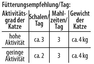 Der tatsächliche Bedarf richtet sich nach Alter, Rasse und Aktivität Ihres Kätzchens. Bitte immer ausreichend frisches Wasser zur Verfügung stellen.