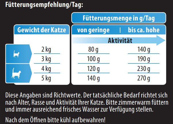 Die richtige Menge an Futter hängt von der Größe, dem Gewicht und dem Aktivitätslevel Ihrer Katze ab.