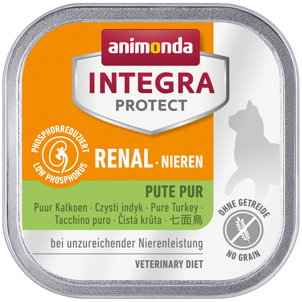 INTEGRA PROTECT Renal wurde speziell für Katzen mit chronischer Niereninsuffizienz entwickelt. Die deutlich geringere Zufuhr von Eiweißen verringert die auszuscheidene Menge an Eiweißabbauprodukten. Die gleichzeitige Reduzierung des Phosphorgehaltes verzögert den fortschreitenden Verlust der Nierenfunktion. Dadurch verbessert sich das Befinden der Katze nachhaltig und die Lebenserwartung kann verlängert werden. Diese Diätnahrung wird ohne Getreide hergestellt und ist damit für Katzen mit einer Getreideallergie geeignet.- phosphorreduziert