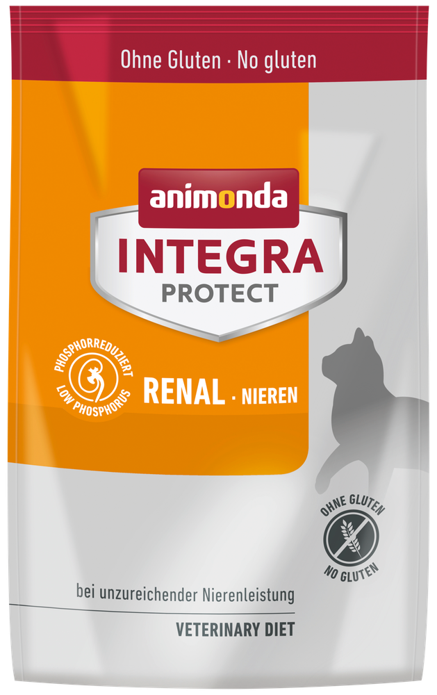 INTEGRA PROTECT Renal wurde speziell für Katzen mit chronischer Niereninsuffizienz entwickelt. Die deutlich geringere Zufuhr von Eiweißen verringert die auszuscheidene Menge an Eiweißabbauprodukten. Die gleichzeitige Reduzierung des Phosphorgehaltes verzögert den fortschreitenden Verlust der Nierenfunktion. Dadurch verbessert sich das Befinden der Katze nachhaltig und die Lebenserwartung kann verlängert werden.- bei chronischer Niereninsuffizienz
