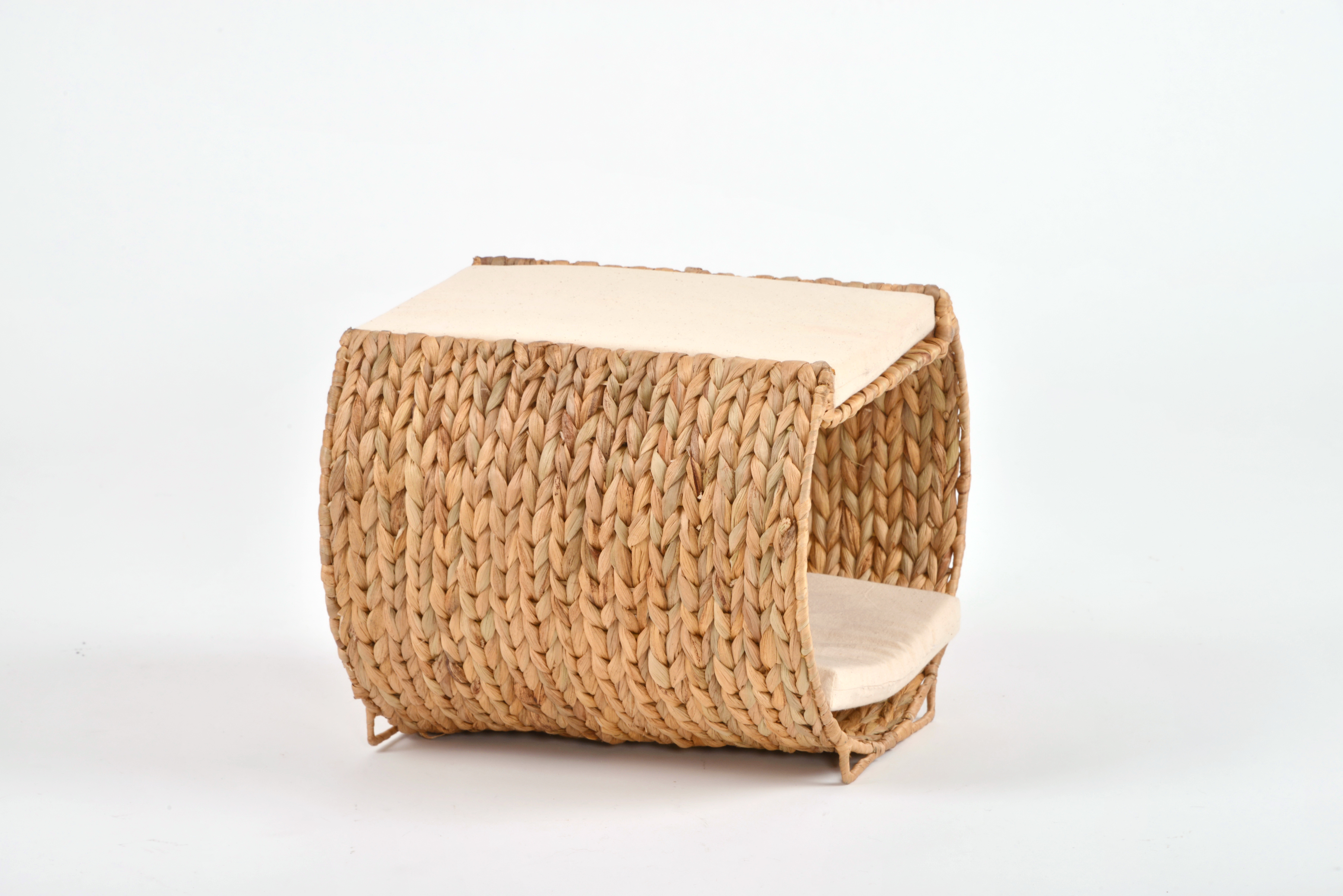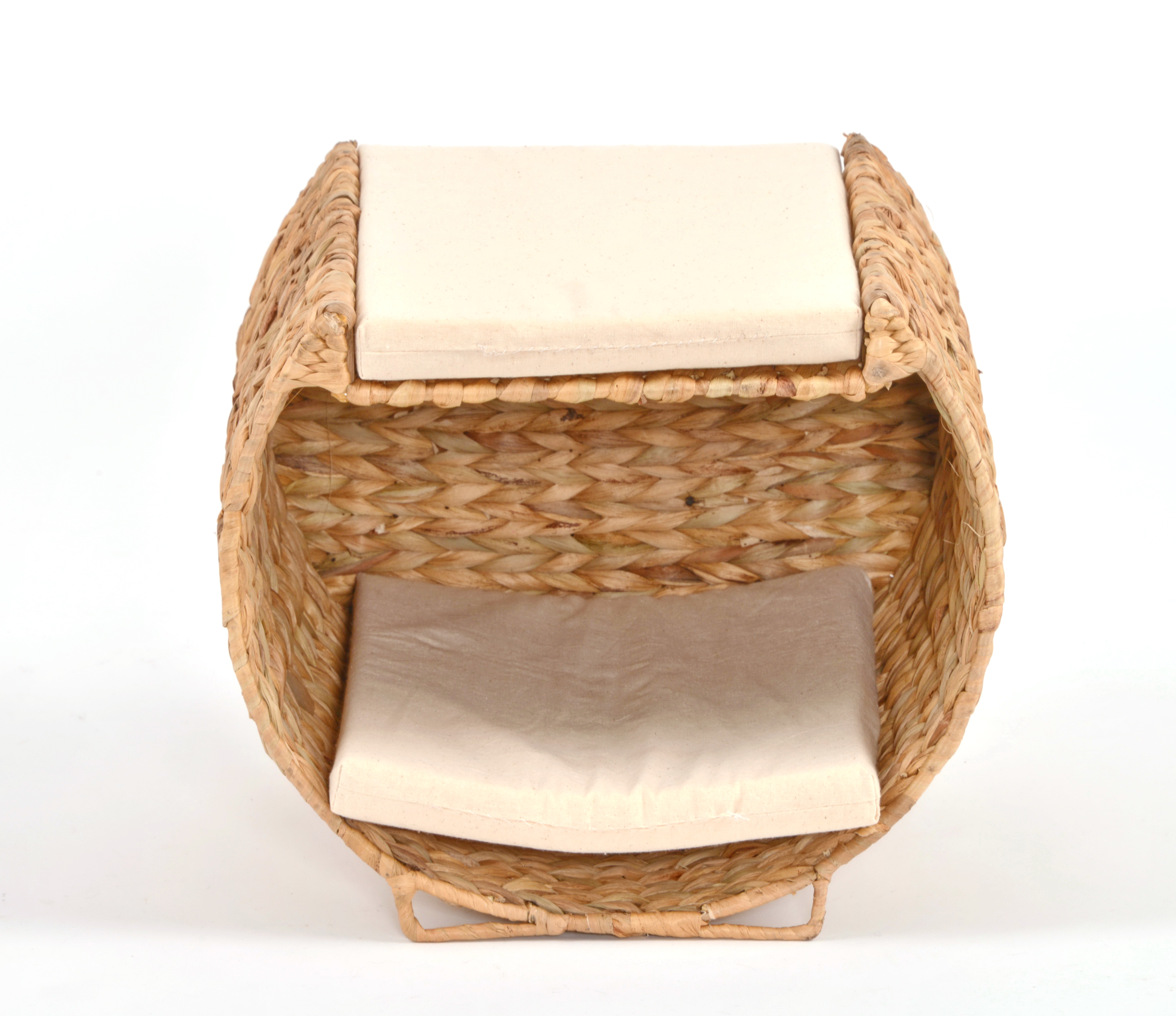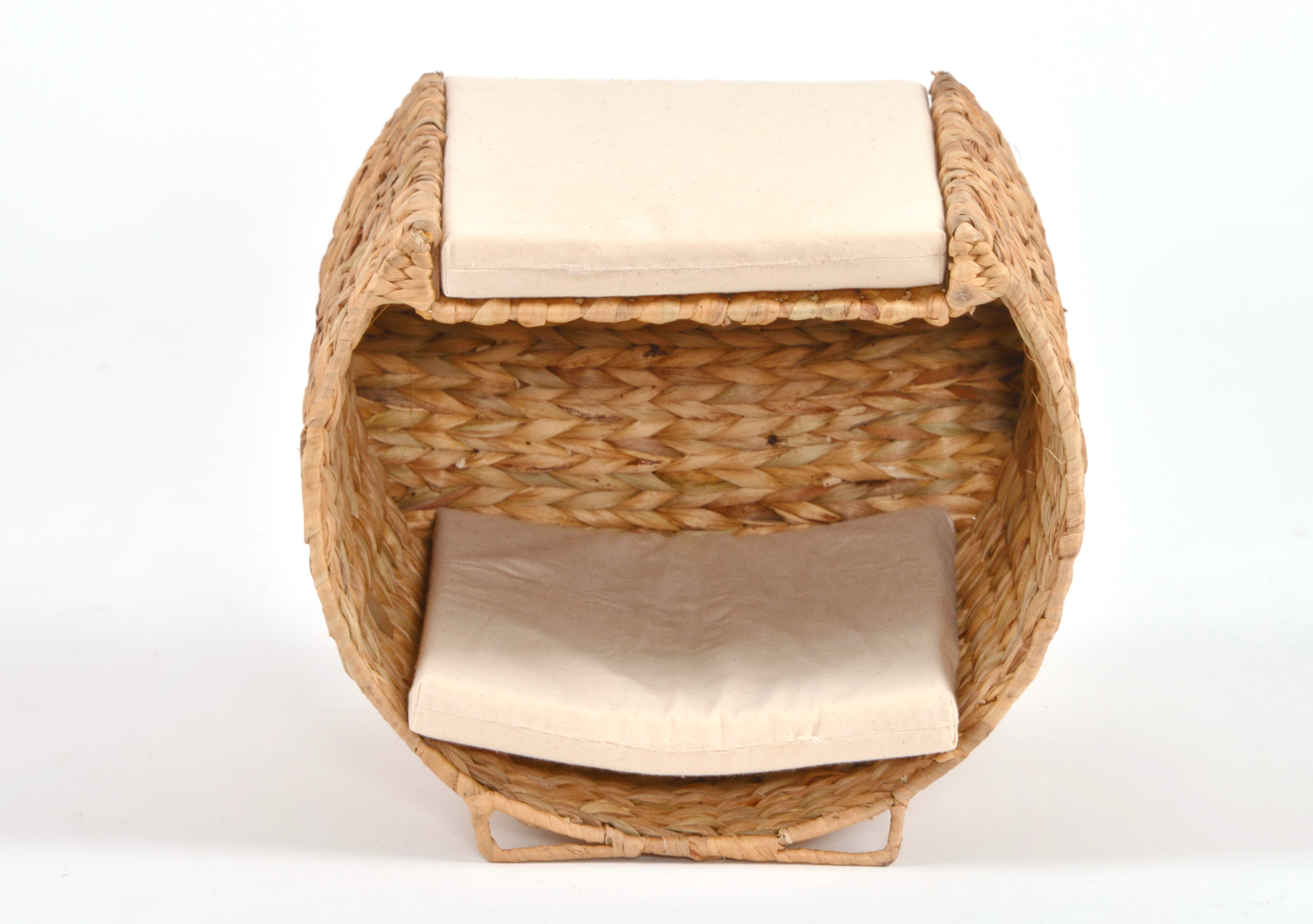 Die Katzenliege bietet zwei komfortable Liegeflächen – eine innen und eine oben auf dem Korb. So kann deine Katze entscheiden, ob sie sich lieber zurückziehen oder das Geschehen überblicken möchte. Dank des stabilen Metallrahmens, der gleichzeitig als Füße dient, ist die Liege besonders robust und sicher. Die Kissen sind mit einem Textilbezug aus 100 % Baumwolle bezogen und mit einer Schaumstoffplatte aus 100 % PU-Schaum ausgestattet – für Liegekomfort.