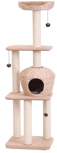 Kratzbäume dienen zur Selbstständigen Beschäftigung Ihrer Katze und bieten oft auch einen Rückzugsort. Außerdem schützen Sie somit Ihre Einrichtung, da Sie Ihrer Katze eine gute Alternative zur Pflege ihrer Krallen bieten. "Nanuk" ist hellbraun, steht auf einer Grundfläche von 50 x 40 cm und ist 156 cm hoch. Die Höhle und die Liegeplatte sind aus Wasserhyazinthe geflochten und die Platten sind mit Jute bespannt. Als Kratzflächen dienen mehrere Sisalstämme