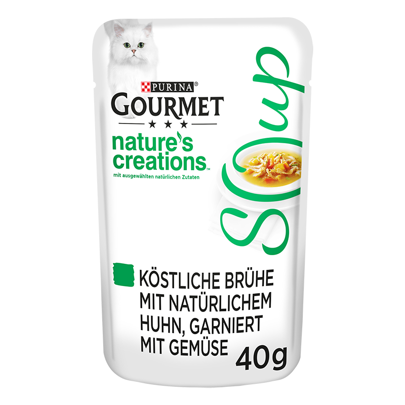 GOURMET Nature's Creations Soup ist ein schmackhaftes Ergänzungsfuttermittel für ausgewachsene Katzen. Die feine Brühe mit natürlichem Huhn und Gemüse verwöhnt Ihre Katze mit echten, erkennbaren Stückchen und einem einzigartigen Geschmackserlebnis – ganz ohne künstliche Zusatzstoffe.Tierart: Katze