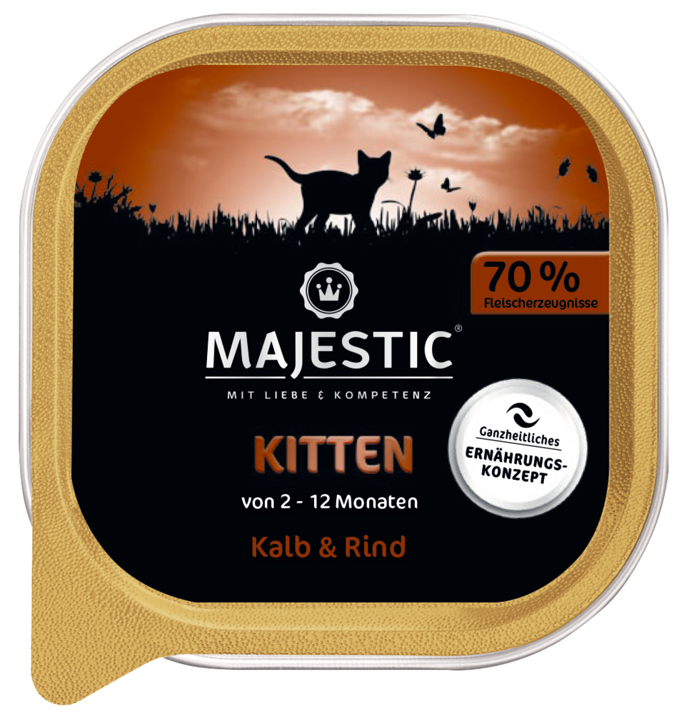 MAJESTIC ist eine vollwertige Hauptmahlzeit mit 70% Fleischerzeugnissen für eine optimale Entwicklung heranwachsender Kätzchen.Alle MAJESTIC-Produkte sind frei von künstlichen Farbstoffen, ohne Zuckerzusatz, ohne Soja und ohne gentechnisch veränderte Zutaten.