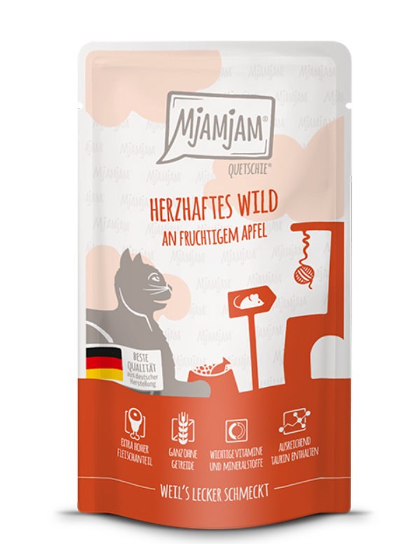 MjAMjAM Quetschie mit Wildschwein und Apfel für katzen 12 x 125 g – herzhaftes Wild an fruchtigem Apfel