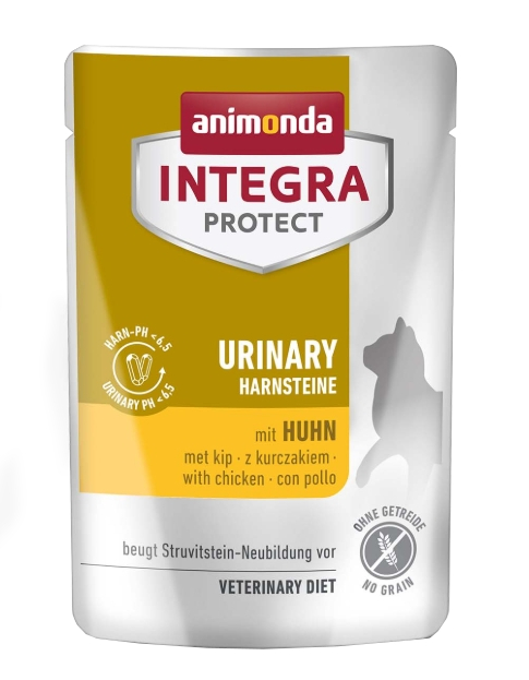 INTEGRA PROTECT Urinary Struvit mit Huhn ist ein Diätalleinfuttermittel speziell für ausgewachsene Katzen, die unter Struvitsteinen leiden oder zu deren Neubildung neigen. Die Rezeptur senkt den Harn-pH-Wert gezielt unter 6,5 und verhindert so die Neubildung von Struvitsteinen. Der abgestimmte Mineralstoffgehalt sowie Inhaltsstoffe wie DL-Methionin und Calciumsulfat unterstützen die Harnansäuerung. Das Futter ist schmackhaft, leicht portionierbar im 85g Frischebeutel und wurde für die besonderen Bedürfnisse kranker Katzen entwickelt.Tierart: Katze