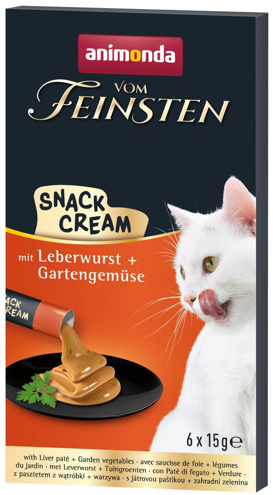 Katzen lieben zwischendurch eine kleine Gaumenfreude! Und sie haben es verdient, verwöhnt zu werden. Ein kleiner Snack mit ausgewählten Zutaten ist da genau das Richtige. Heißgeliebt von Samtpfoten ist die neue, köstliche animonda Vom Feinsten Snack-Cream. Sie ist besonders cremig und eine wahre Delikatesse für Katzen. Die Variante mit Leberwurst überzeugt durch einen pikanten Leberwurst-Geschmack kombiniert mit bekömmlichem Gartengemüse. Eine Schachtel enthält sechs Einzelportionen und kann dadurch immer frisch angeboten werden.- einzigartiger Genuss