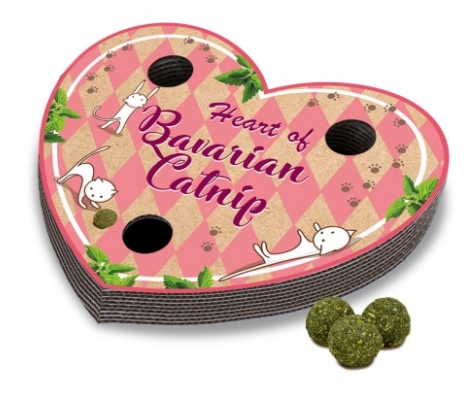 Herzförmiges Spielbrett für Katzen mit drei Katzenminze-Murmeln. Der Duft der bayerischen Katzenminze kann zum Spielen anregen. Die seitliche Wellkartonfläche eignet sich zur Krallenpflege.
