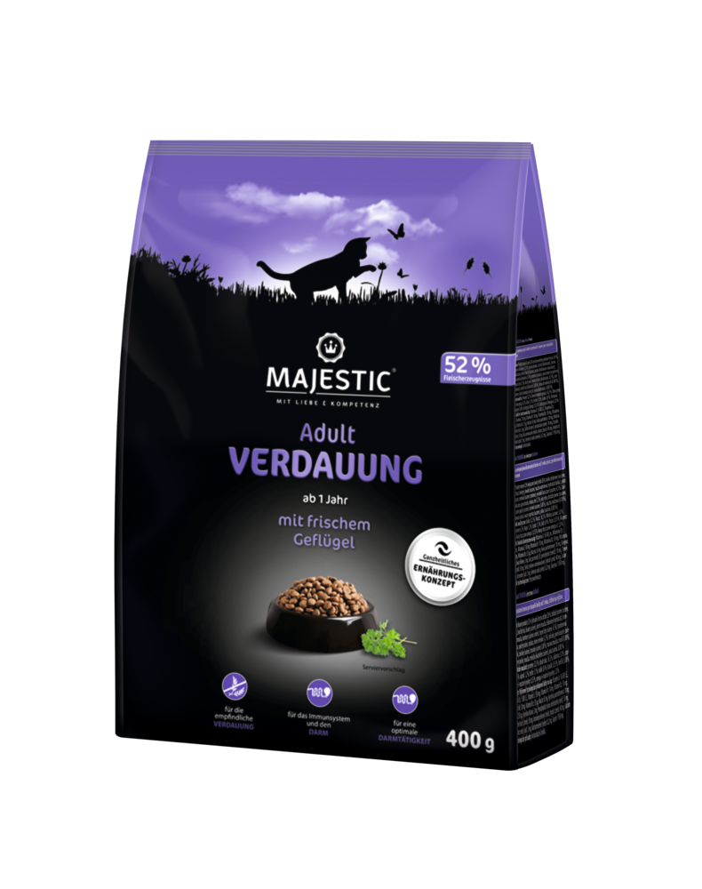 MAJESTIC ist eine vollwertige Hauptmahlzeit mit wertvollen Proteinquellen für eine optimale Ernährung ausgewachsener Katzen. MAJESTIC VERDAUUNG für sensible Feinschmecker ist glutenfrei, bekömmlich und leicht verdaulich. Sie versorgt Ihre Lieblinge mit empfindlicher Verdauung und Nahrungsmittelunverträglichkeiten optimal mit allen Nährstoffen, die sie für ein langes und aktives Leben brauchen. Alle MAJESTIC-Produkte sind frei von künstlichen Farbstoffen, ohne Zuckerzusatz, ohne Soja, ohne gentechnisch veränderte Zutaten, ohne Weizen und ohne Mais.