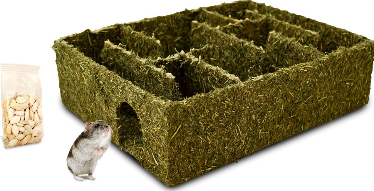 Ergänzungsfuttermittel und Behausung für alle kleinen Nager wie Hamster oder Mäuse. Nagetiere sind in freier Natur ständig mit der Futtersuche beschäftigt. Mit dem JR FARM Snack-Labyrinth kann dein Tier auch zu Hause diesen natürlichen Instinkt ausleben und gleichzeitig seine Sinnesorgane trainieren.Verstecke die beigefügten Kürbiskerne in den Gängen und dein Tier wird sofort freudig damit beginnen, diese im Labyrinth aufzuspüren. Alternativ zu den Kürbiskernen kannst du natürlich auch andere Leckereien verwenden. Das Snack-Labyrinth besteht aus mit Heu ummantelten Naturfaserwänden, die komplett verzehrt werden können.