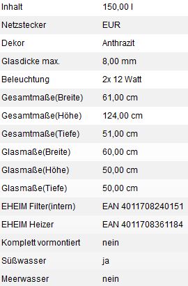 Bei diesem „All-Inclusive-Programm“ aus Aquarium mit EHEIM LED-Beleuchtung, Unterschrank, Filter, Heizer und biologischen Filtermedien ist alles perfekt aufeinander abgestimmt. Sie müssen sich nur noch um Fische und Pflanzen kümmern. Außerdem lässt sich die EHEIM vivalineLED Serie perfekt auf Ihre Einrichtung abstimmen. Denn das neue Dekorbrett ist austauschbar. Das Dekorbrett ist geschraubt und lässt sich selbstverständlich auch bei gefülltem Aquarium austauschen. Damit wird Ihr neues Aquarium so individuell wie Sie selbst.Die energieeffiziente EHEIM LED-Beleuchtung ist zur besseren Handhabung verschiebbar. Die Schiebeabdeckung besteht aus hochwertigen Aluverbundplatten, der Abdeckrahmen mit Öffnungen für alle Zuleitungen ist fest aufgeklebt. Das 150 Liter Aquarium sticht aus der Reihe der EHEIM vivalineLED Kombinationen durch seine Form heraus - mit 60 Zentimetern Breite und 50 Zentimetern Tiefe ist es fast quadratisch.