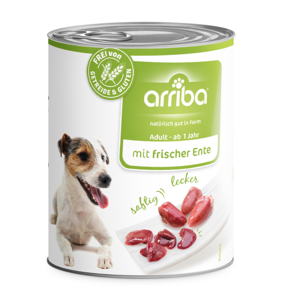 Mit arriba natürlich gut in Form. 71 % Fleisch sowie Innereien, stets frisch und schonend verarbeitet, sorgen für eine besondere Akzeptanz und Bekömmlichkeit. Distelöl mit seinem hohen Gehalt an ungesättigten Fettsäuren kann den Zellschutz und die körpereigenen Abwehrkräfte unterstützen. Getreidefreies Nassfutter mit lecker Ente für Hunde in der großen 800g Dose.arriba® Hundenassfutter mit Ente ist: