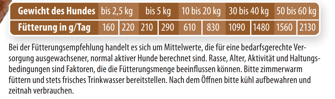 Bei der Fütterungsempfehlung handelt es sich um Mittelwerte, die für eine bedarfsgerechte Versorgung ausgewachsener, normal aktiver Hunde berechnet sind. Rasse, Alter, Aktivität und Haltungsbedingungen
