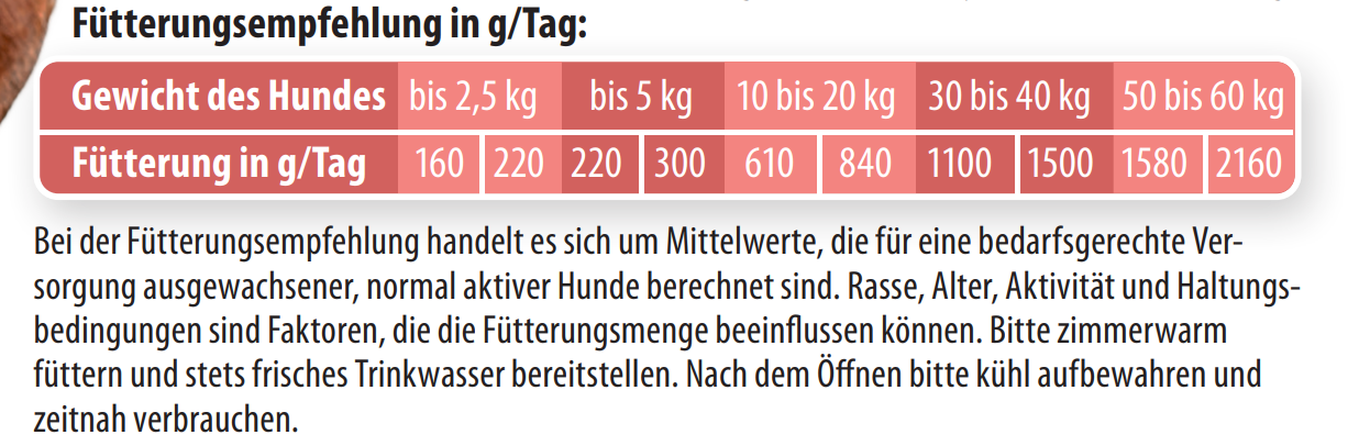 Bei der Fütterungsempfehlung handelt es sich um Mittelwerte, die für eine bedarfsgerechte Versorgung ausgewachsener, normal aktiver Hunde berechnet sind. Rasse, Alter, Aktivität und Haltungsbedingungen