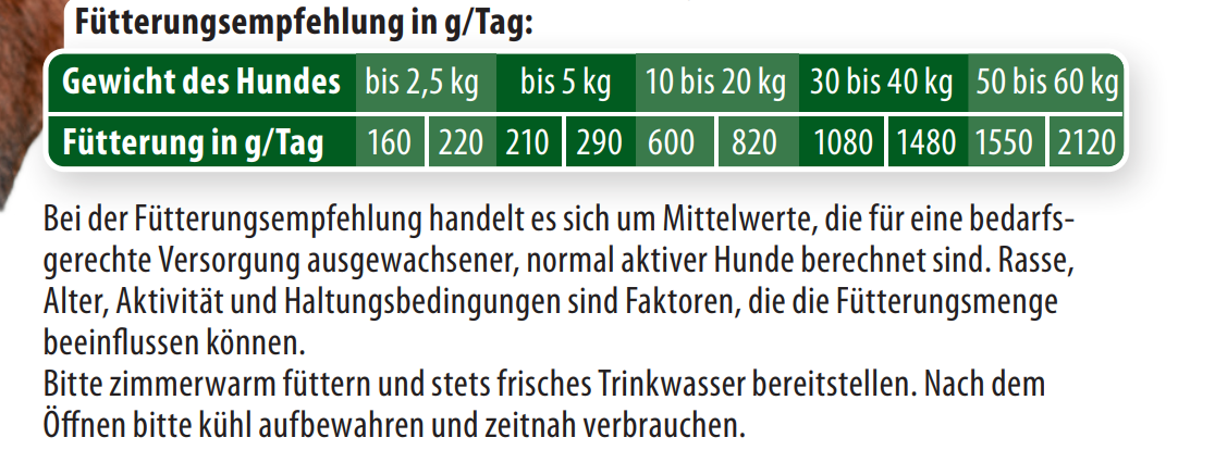 Bei der Fütterungsempfehlung handelt es sich um Mittelwerte, die für eine bedarfsgerechte Versorgung ausgewachsener, normal aktiver Hunde berechnet sind. Rasse, Alter, Aktivität und Haltungsbedingungen
