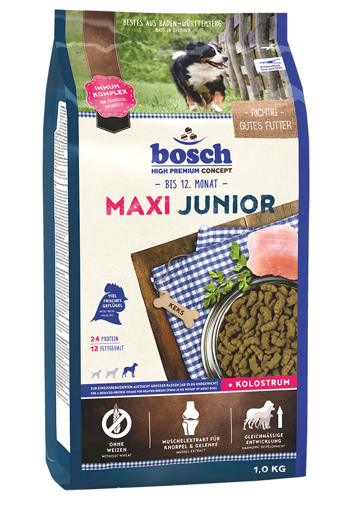 MAXI JUNIOR ist ein eiweißreduziertes, weizenfreies Aufzuchtfutter (24 % Eiweiß) mit moderatem Energiegehalt zur Aufzucht großer Rassen (ab 25 kg Endgewicht), bei denen wegen möglicher Knorpel- und Gelenkprobleme eine zu hohe Wachstumsgeschwindigkeit vermieden werden sollte. Muschelextrakte unterstützen die Knorpel- & Gelenkentwicklung des Junghundes. Durch den Einsatz von Kolostrum wird das Immunsystem ebenso gestärkt wie durch den spezifischen Immun-Komplex aus Mannanen und Glucanen (von Tierärzten entwickelt). Krokettenform & -größe sind auf das Futteraufnahmeverhalten großer Rassen abgestimmt.- mittlerer Energiegehalt (12 % Fett)