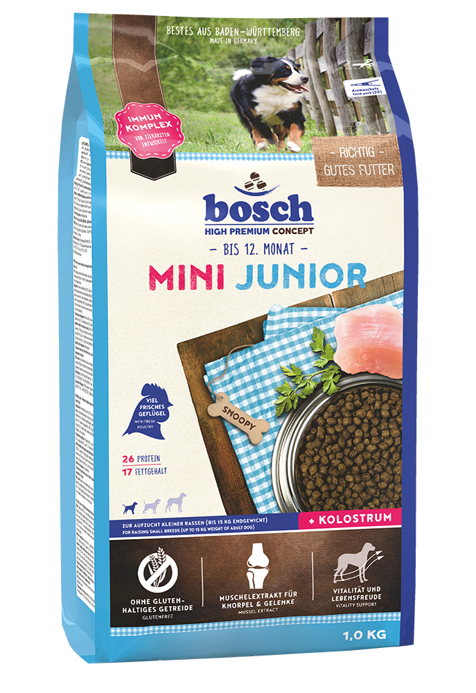 Zur Aufzucht kleiner Rassen (bis 15 kg Endgewicht) ist ein speziell zusammengesetztes Aufzuchtfutter mit angepasster Krokettenform und -größe, sowie abgestimmter Eiweiß- und Mineralstoffgehalte erforderlich.MINI JUNIOR wird ohne glutenhaltiges Getreide unter Verwendung von frischem Geflügel (min. 25 %) hergestellt. Durch den Einsatz von Kolostrum wird das Immunsystem ebenso gestärkt wie durch den spezifischen Immun-Komplex aus Mannanen und Glucanen (von Tierärzten entwickelt). Die enthaltenen Muschelextrakte unterstützen die Knorpel- und Gelenkentwicklung.