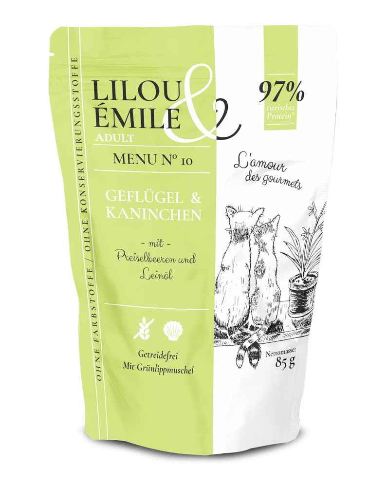 Lilou & Emile mit Geflügel, Kaninchen für Katzen 12 x 85 g – mit Preiselbeeren und Leinöl