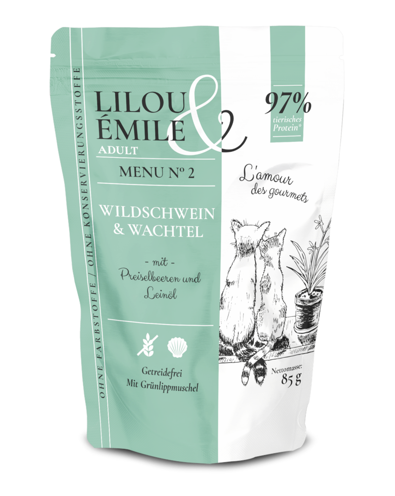Herzlich willkommen in der kulinarischen Welt von Lilou & Émile!Lilou & Émile ist ein hochwertiges Futtermittel für Katzen und überzeugt mit erlesenen Zutaten. Tauchen Sie mit unseren köstlichen Menus ein in die Haute Cuisine Frankreichs und schwelgen Sie in den Genüssen. Feines Fleisch wird mit ausgewählten Ingredienzen wie Preiselbeeren, dem Extrakt der Grünlippmuschel und Leinsaat zubereitet.
