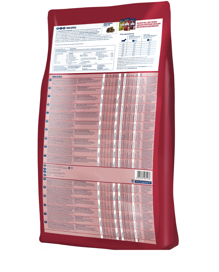 Verwöhne deinen vierbeinigen Freund mit der einzigartig bekömmlichen Komposition von Happy Dog Mini Africa. Die getreidefreie Rezeptur mit delikatem Strauß ist besonders gut verträglich für deinen Liebling und daher auch ideal geeignet für anspruchsvolle und ernährungssensible Feinschmecker kleiner Rassen. Wertvolle Omega-3- und Omega-6-Fettsäuren – als Unterstützung für ein glänzendes Fell – runden diese exklusive Rezeptur, die auf dem einzigartigen Happy Dog Natural Life Concept basiert, ab. Mit unseren Happy Dog Supreme Sensible Mini Produkten fütterst du beste Premium-Qualität „Made in Germany“.Tierart: Hund