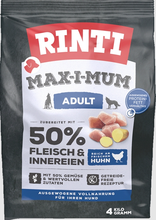 RINTI MAX-I-MUM Adult bietet eine ausgewogene Mahlzeit für Hunde. Die Rezeptur besteht zu 50% aus Fleisch und Innereien und zu 50% aus Gemüse und weiteren wertvollen Zutaten. Dies sorgt für eine ausgewogene Ernährung mit einem optimalen Verhältnis von Protein, Fett und Ballaststoffen sowie einem ausgeglichenen Calcium-/Phosphor-Verhältnis.