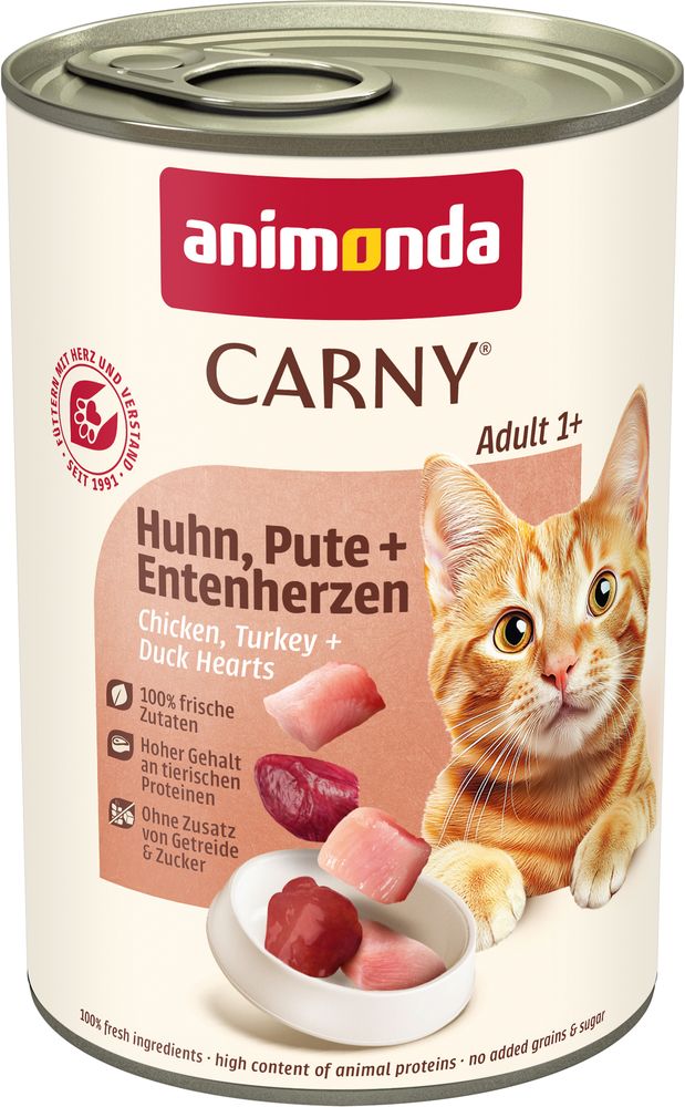 So köstlich, dass kein Fleischstückchen im Napf bleibt! Carny Adult Huhn, Pute + Entenherzen bietet deiner Katze ein unvergessliches Geschmackserlebnis.Die leicht bekömmlichen Zutaten vom Huhn, ergänzt durch feine Puten- und Entenherzen, sorgen für wahre Gaumenfreuden.