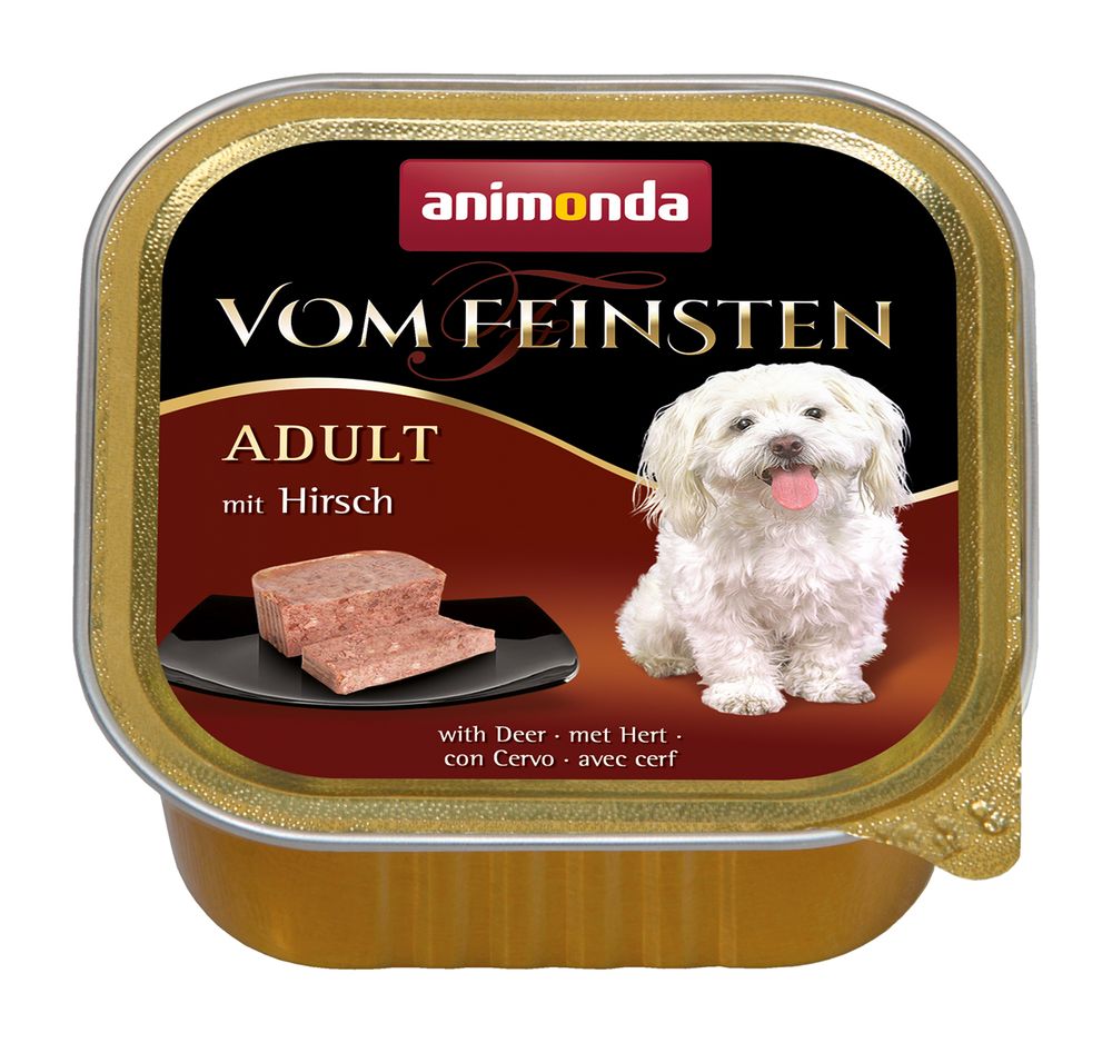 Die Vom Feinsten Adult Pastete mit Hirsch ist getreide- und sojafrei und überzeugt Feinschmecker-Hunde mit ihrer feinen Konsistenz.