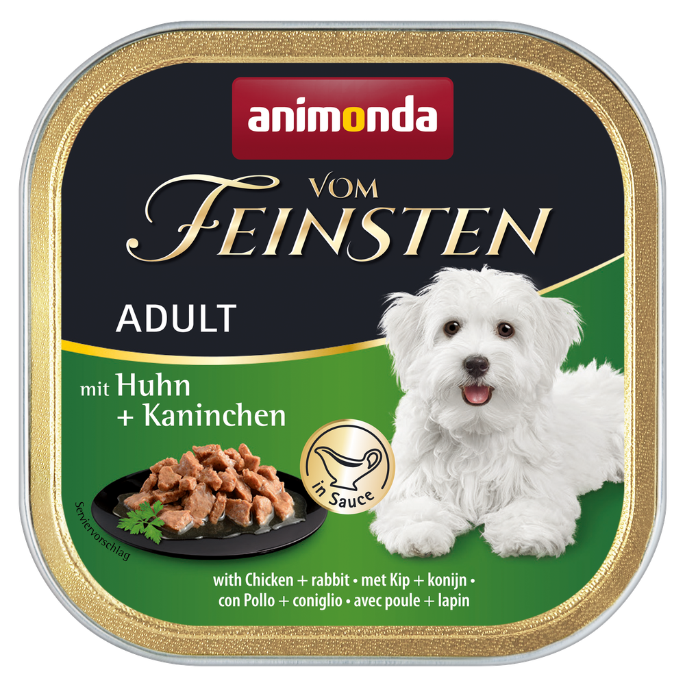 Vom Feinsten Adult mit Huhn und Kaninchen in Sauce überzeugt Feinschmecker-Hunde mit vorzüglichem Geschmack – ohne Getreide, Soja und Zucker.