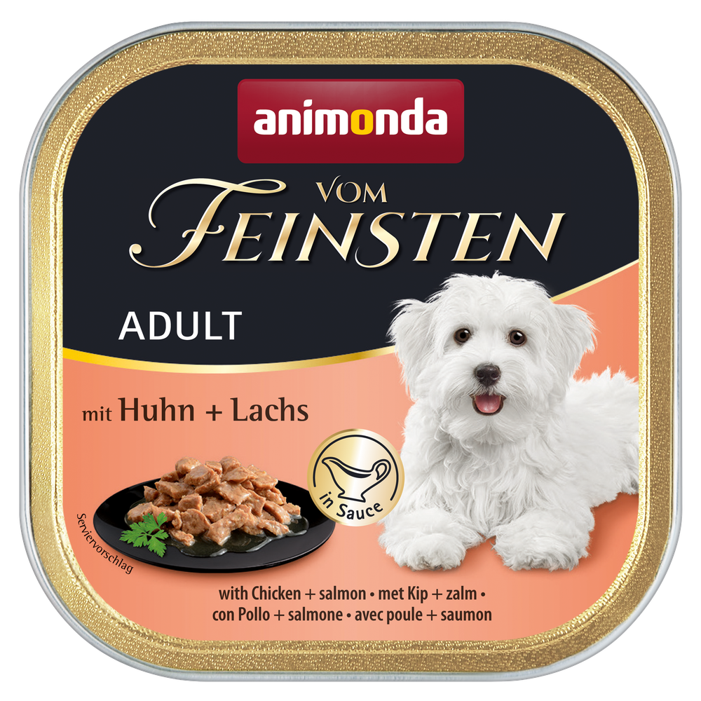 Einzigartiger Genuss für Hunde-Gourmets!Vom Feinsten Adult mit Huhn und Lachs in Sauce überzeugt ausgewachsene Vierbeiner gleich doppelt: