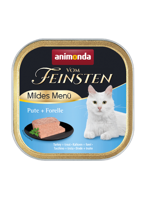 Vom Feinsten Adult Mildes Menü steht für ausgewogene, leckere gesunde Ernährung auf höchstem Niveau für ausgewachsene Katzen von 1 - 6 Jahren. Leckere Rezepturen ausschließlich aus hoch verdaulichem Putenfleisch - ohne Innereien und Leber - bieten Katzen einen besonderen Genuss. Die fein-stückigen Pasteten versorgen die ausgewachsene Katze mit allen lebenswichtigen Nährstoffen.Inverkehrbringer: animonda Petcare gmbh, Frankfurter Str. 31, 49214 Bad Rothenfelde, E-Mail: info@animonda.de