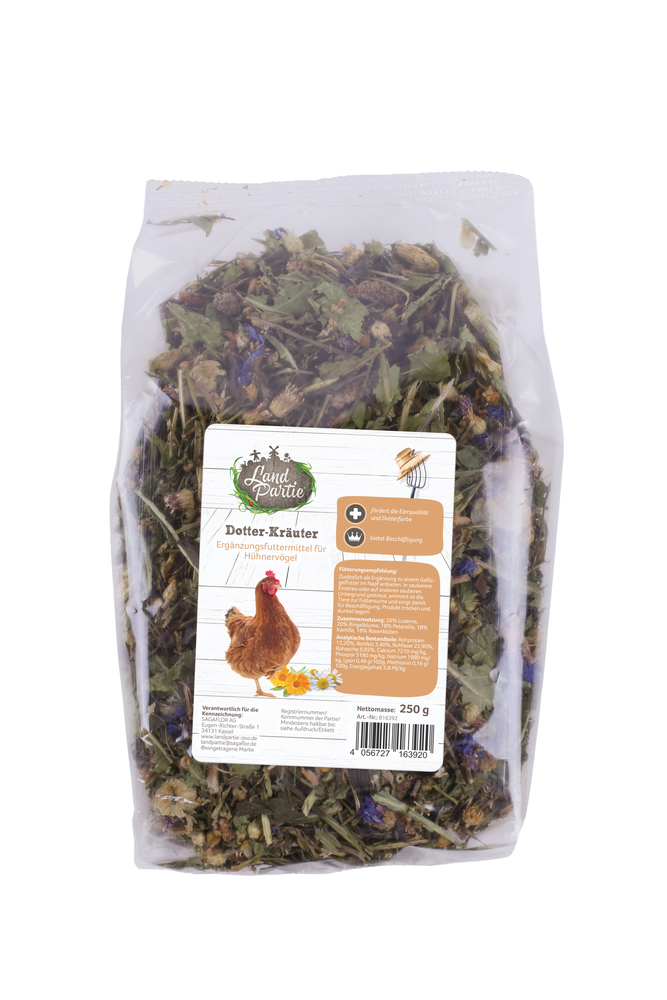Dieses hochwertige Ergänzungsfuttermittel wurde speziell entwickelt, um die Eierqualität und Dotterfarbe von Hühnern auf natürliche Weise zu fördern. Die sorgfältig ausgewählte Mischung aus Kräutern wie Luzerne, Ringelblume, Petersilie, Kamille und Rosenblüten unterstützt nicht nur eine intensive Dotterfärbung, sondern trägt auch zu einem gesunden Verdauungssystem und allgemein vitalen Tieren bei.Tierart: Hühnervögel