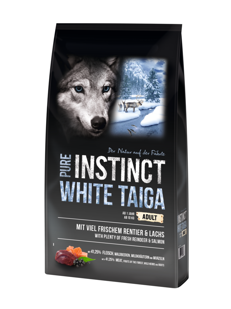 PURE INSTINCT White Taiga besteht aus der Varietät Rentier und Lachs und ist ideal für Hunde ab 1 Jahr / ab 10 kg geeignet. PURE INSTINCT setzt auf eine ursprüngliche Ernährung mit der Unterstützung von Waldbeeren, Wildkräutern und Wurzeln, um den Ansprüchen einer ursprünglichen Fütterung gerecht zu werden.
