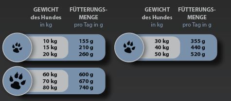 Ihr Hund sollte sich an die Nahrung erst gewöhnen. Deshalb wird in den ersten 6 Tagen zur Eingewöhnung PURE INSTINCT mit Ihrem herkömmlichen Futter gemischt. Die ersten 3 Tage 1⁄3, dann 2⁄3 und ab dem 6. Tag die volle Ration PURE INSTINCT füttern. In jedem Fall ist unsere Empfehlung ein Mittelwert und bedarf einer Anpassung der Fütterungsmenge, entsprechend der Rasse, des Alters, der Witterung oder der Aktivität Ihres Hundes. Bitte stets frisches Trinkwasser bereitstellen.
