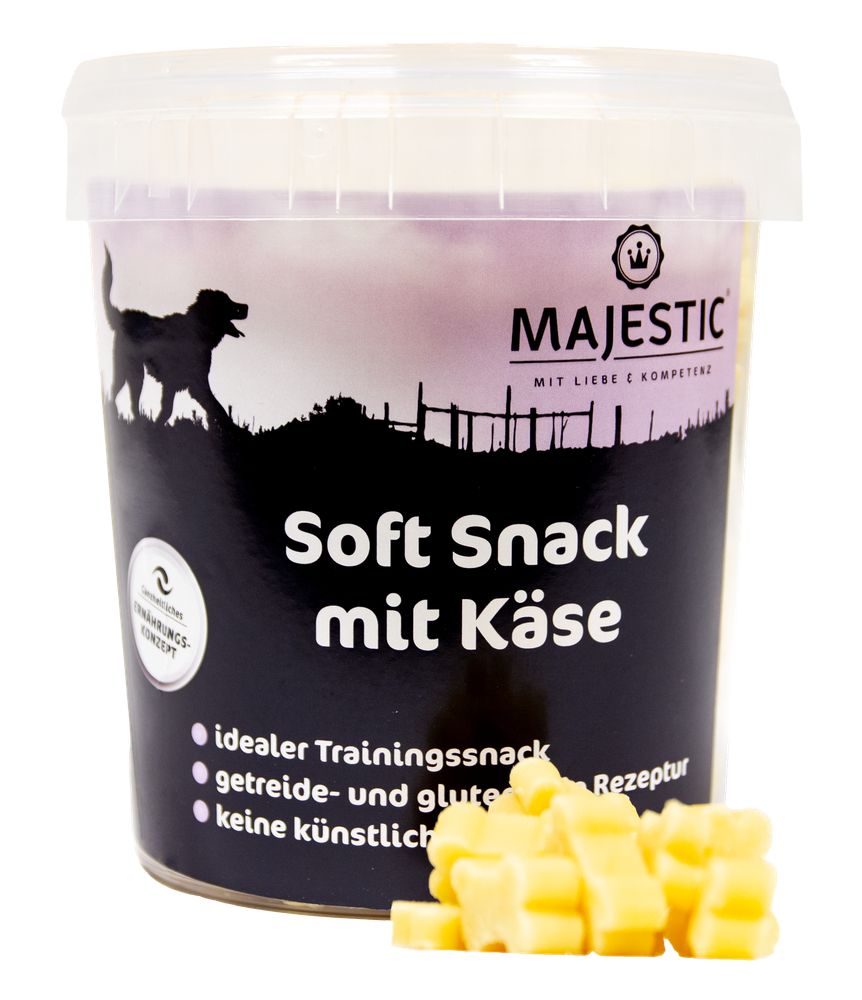 Der köstliche Soft Snack mit Käse ist schonend ofengetrocknet und die Rezeptur ohne künstliche Zusatzstoffe. Er ist ein idealer weicher Trainingssnack und bringt Abwechslung in den Napf für Hunde, die bewusst ernährt werden. Der Käse liefert von Natur aus Calcium für Zähne und Gelenke. Wir empfehlen unser ganzheitliches MAJESTIC®-Ernährungskonzept. Hierbei sind Trocken- und Nassnahrung sowie Snacks
