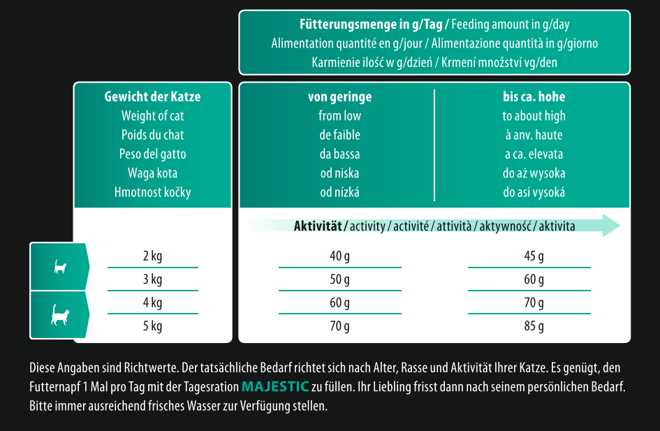 Die richtige Menge an Futter hängt von der Größe, dem Gewicht und dem Aktivitätslevel Ihrer Katze ab.
